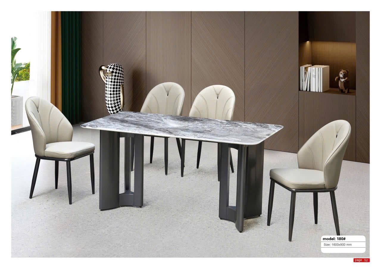 Bàn ăn nhập khẩu SA 180 với mặt bàn hình chữ nhật phô diễn họa tiết vân đá mây xám trắng, bề mặt bóng mờ tạo nên vẻ sang trọng ngay từ cái nhìn đầu tiên. Điểm thu hút chính là phần chân đế: hai khối hình học vát chéo, màu xám đậm, tạo thành thế đứng vững chãi và đầy cá tính. Kiểu dáng này khác biệt hoàn toàn với những thiết kế chân bàn thông thường. Ghế đi kèm có phần tựa lưng cao, dáng cong ôm trọn theo tư thế ngồi. Đệm ghế dày màu kem sáng tương phản với phần chân kim loại mỏng, thẳng, tạo cảm giác thanh thoát.