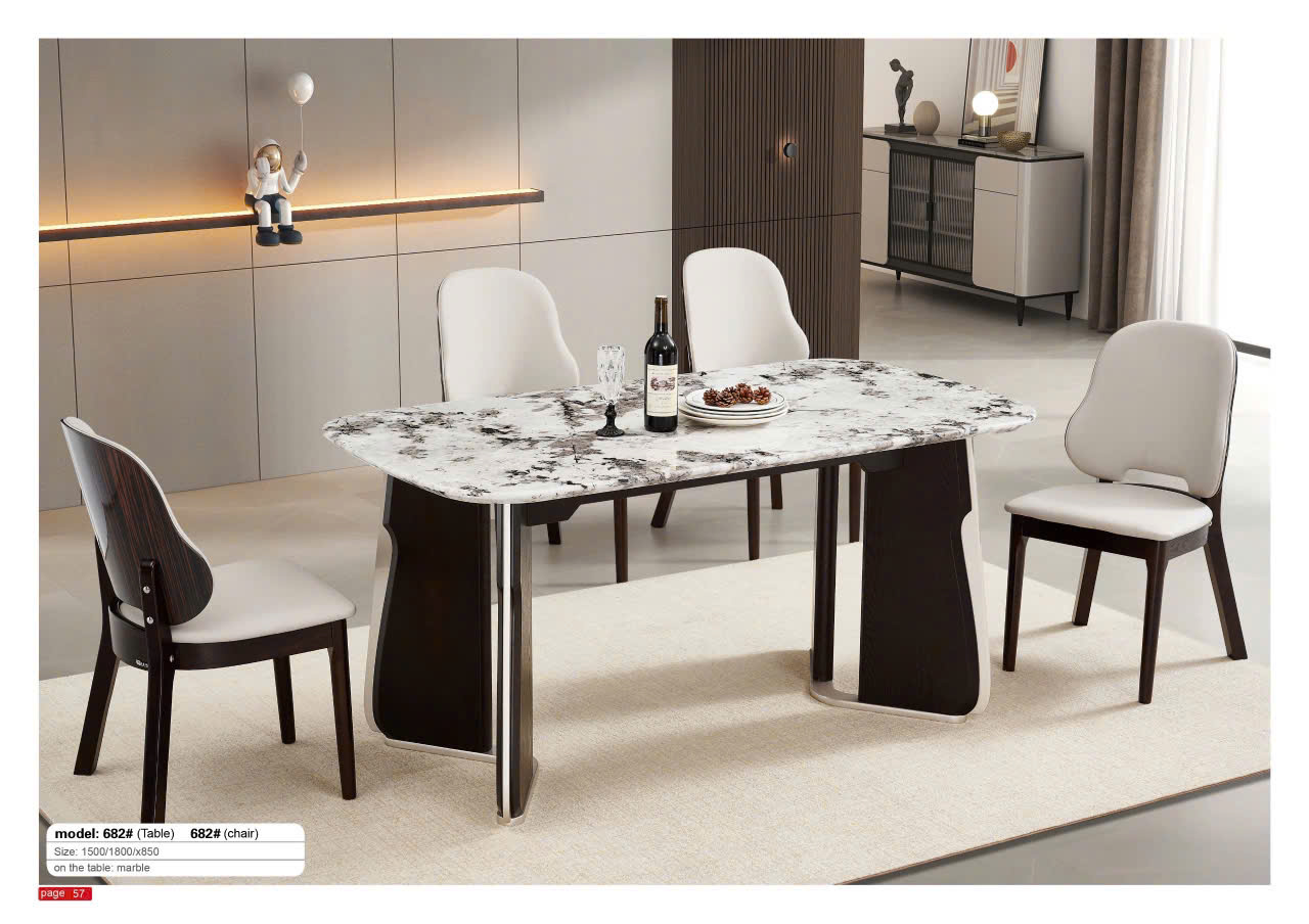 Bàn ăn nhập khẩu SA 682 với mặt bàn hình chữ nhật với các góc bo tròn nhẹ, phô bày họa tiết vân đá trắng và xám đen đậm nét trên nền bóng mờ. Hai khối chân đế màu nâu đen bóng, với thiết kế bản rộng uốn cong hình chữ U ngược, tạo thế đứng vững chãi và đầy cá tính. Viền kim loại sáng bóng dọc theo đáy chân là điểm nhấn tinh tế, làm bật lên hình khối mạnh mẽ. Ghế đi kèm có phần tựa lưng cong mềm mại, tương phản giữa mặt sau gỗ nâu đen bóng và đệm ngồi màu trắng sáng. Sự đối lập màu sắc giữa mặt bàn sáng, đệm ghế sáng với chân bàn và khung ghế tối màu tạo nên một tổng thể hài hòa mà ấn tượng.