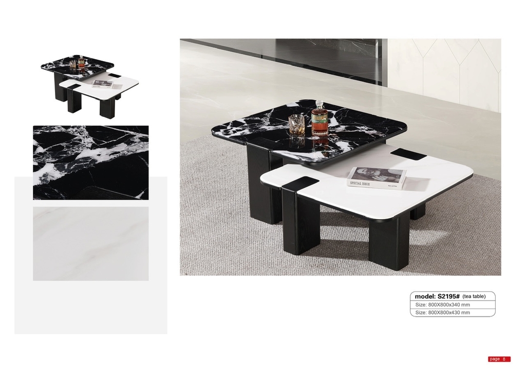 Bàn trà nhập khẩu S2195 sở hữu thiết kế hiện đại, tinh gọn với kiểu dáng module gồm hai mặt bàn tách rời, tạo điểm nhấn độc đáo cho không gian phòng khách. Sự kết hợp giữa mặt bàn sáng vân đá và mặt bàn tối sang trọng mang lại cảm giác cao cấp, đồng thời giúp tổng thể trở nên linh hoạt và có chiều sâu thẩm mỹ. Phần chân bàn bản lớn, vuông vức tạo cảm giác chắc chắn, đồng thời giữ được sự cân đối với các bộ sofa hiện đại. Kiểu dáng thấp, gọn giúp tối ưu không gian sinh hoạt, thuận tiện khi sử dụng hằng ngày.