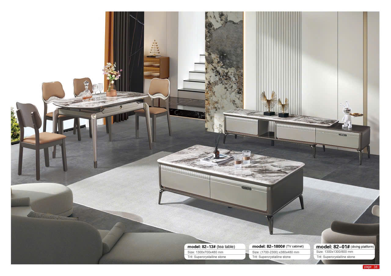 Bàn trà nhập khẩu SA 82-13 với mặt bàn là sự kết hợp giữa các mảng nâu đậm và trắng kem, tạo thành những đường vân mờ lớn trải đều, mang đến cảm giác hiện đại và thanh lịch. Các cạnh được mài vát và bo tròn nhẹ, giúp tổng thể trở nên mềm mại hơn mà không mất đi sự sang trọng.