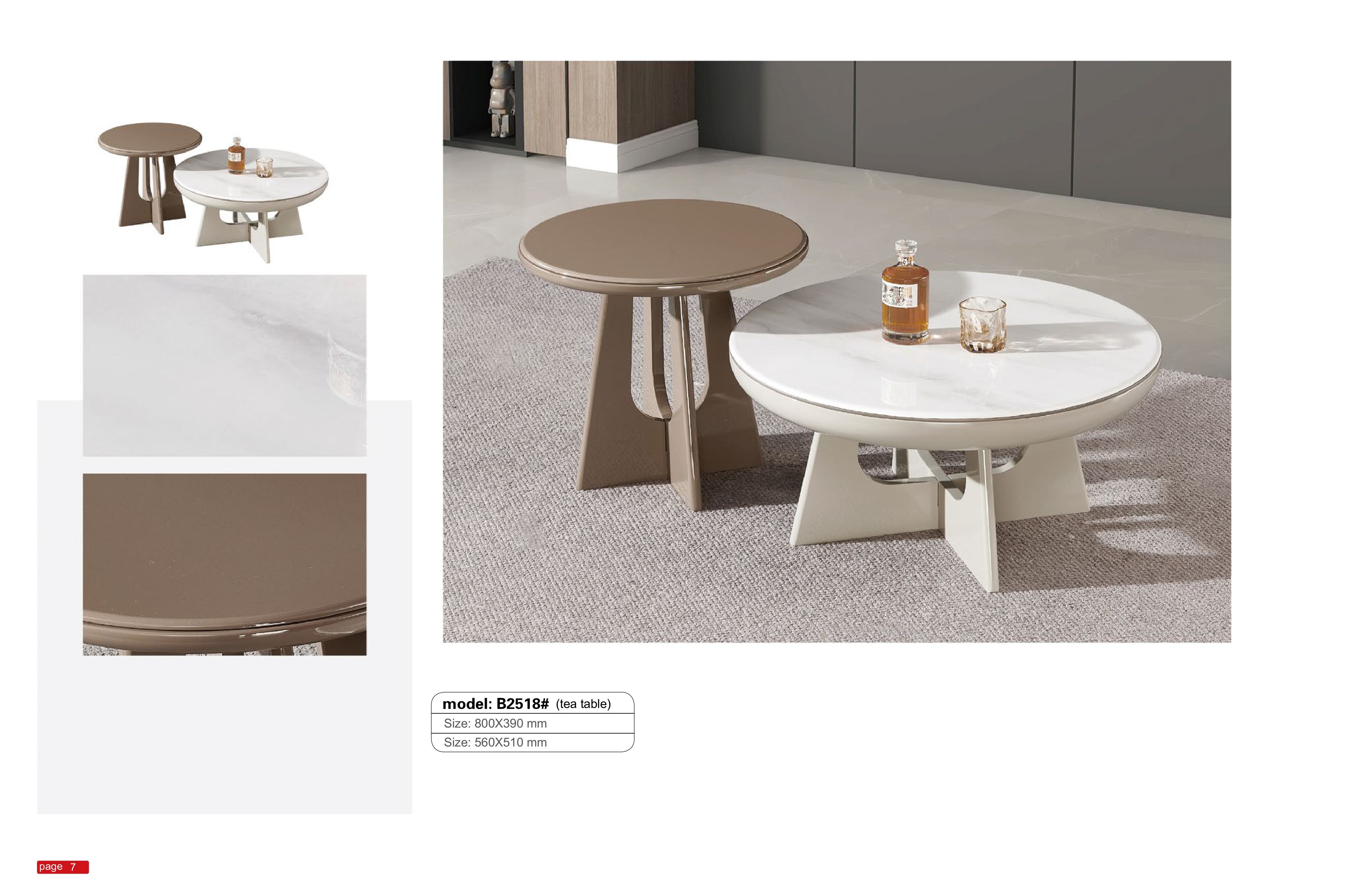 Bàn trà nhập khẩu B2518 gây ấn tượng với thiết kế 2 bàn tròn lồng ghép hiện đại, tạo điểm nhấn tinh tế cho không gian phòng khách. Mặt bàn lớn sử dụng tông trắng vân đá sang trọng kết hợp bàn phụ màu nâu ấm, mang lại sự hài hòa và dễ dàng phối hợp với nhiều mẫu sofa khác nhau. Phần chân bàn thiết kế bản lớn chắc chắn, đảm bảo độ ổn định đồng thời tăng tính thẩm mỹ cho tổng thể sản phẩm.