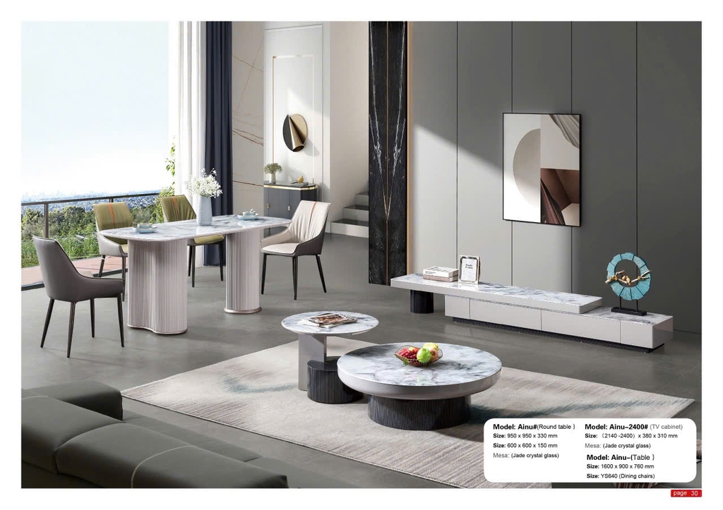 Bàn trà nhập khẩu SAN nổi bật với thiết kế tròn hiện đại, mang phong cách tinh giản nhưng vẫn toát lên vẻ sang trọng cho không gian phòng khách. Mặt bàn được hoàn thiện từ chất liệu Jade Crystal Glass cao cấp với vân đá tinh tế, bề mặt sáng bóng giúp tăng tính thẩm mỹ đồng thời dễ dàng vệ sinh trong quá trình sử dụng.