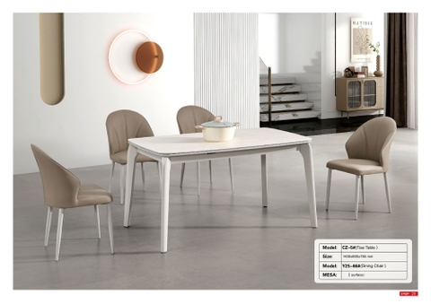 Bộ bàn ăn CZ-5 nổi bật với thiết kế hiện đại, tinh giản theo phong cách châu Âu, mang lại cảm giác nhẹ nhàng và sang trọng cho không gian phòng ăn. Tone màu sáng kết hợp cùng đường nét mềm mại giúp tổng thể trở nên thanh thoát, phù hợp với các căn hộ chung cư hoặc nhà phố theo phong cách tối giản.