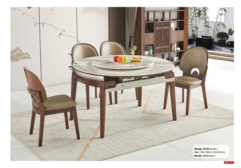 Bộ bàn ăn G74 sở hữu thiết kế bàn tròn hiện đại, mang lại cảm giác quây quần, gắn kết cho những bữa cơm gia đình. Mặt bàn rộng rãi, bề mặt sáng đẹp, dễ lau chùi và sử dụng lâu dài.