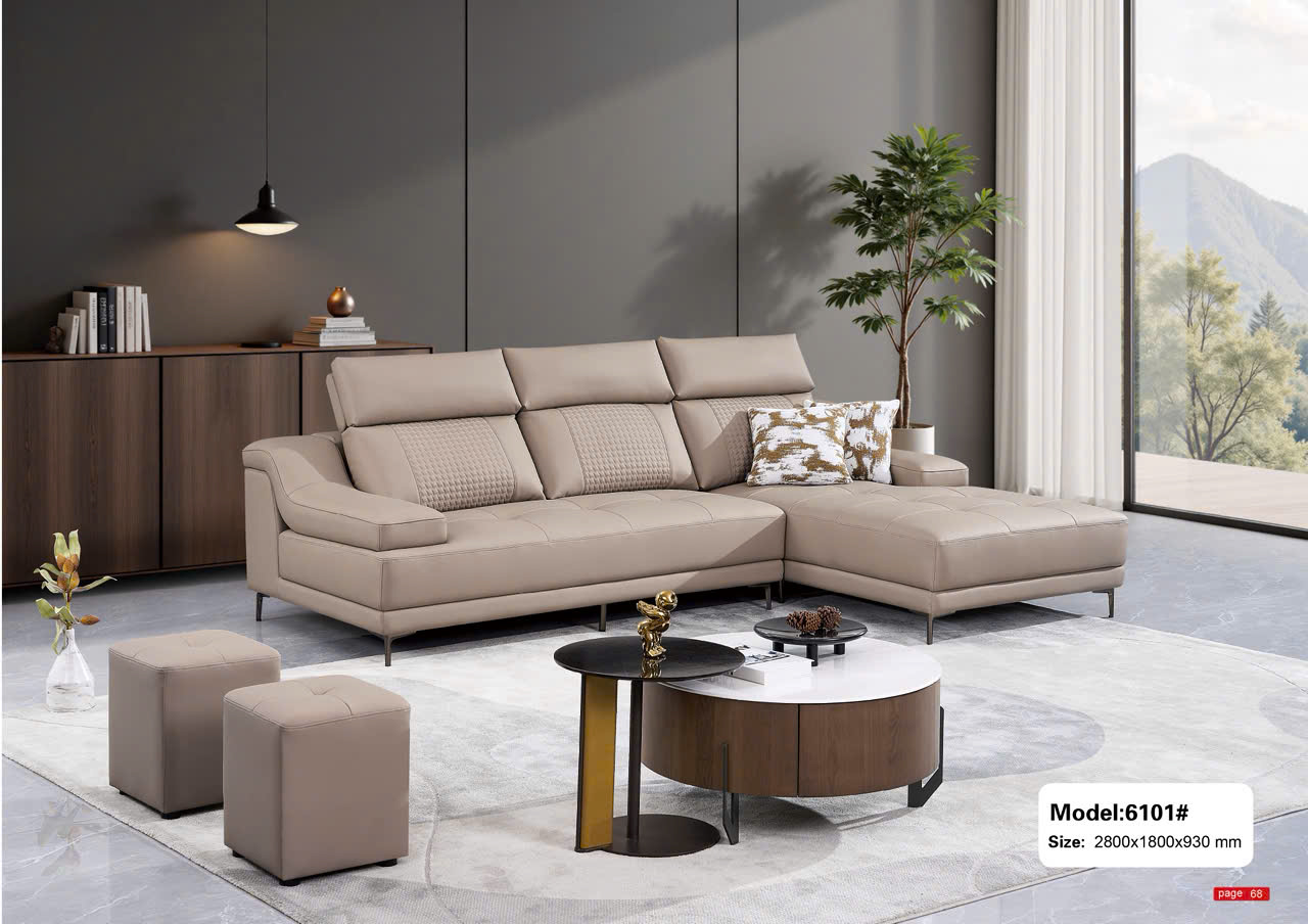 Sofa da nhập khẩu SA6101 sở hữu thiết kế sofa góc L hiện đại, form rộng rãi, phù hợp phòng khách có diện tích trung bình đến lớn. Chất liệu da sinh thái cao cấp mềm mịn, thoáng, dễ vệ sinh và giữ màu ổn định theo thời gian.