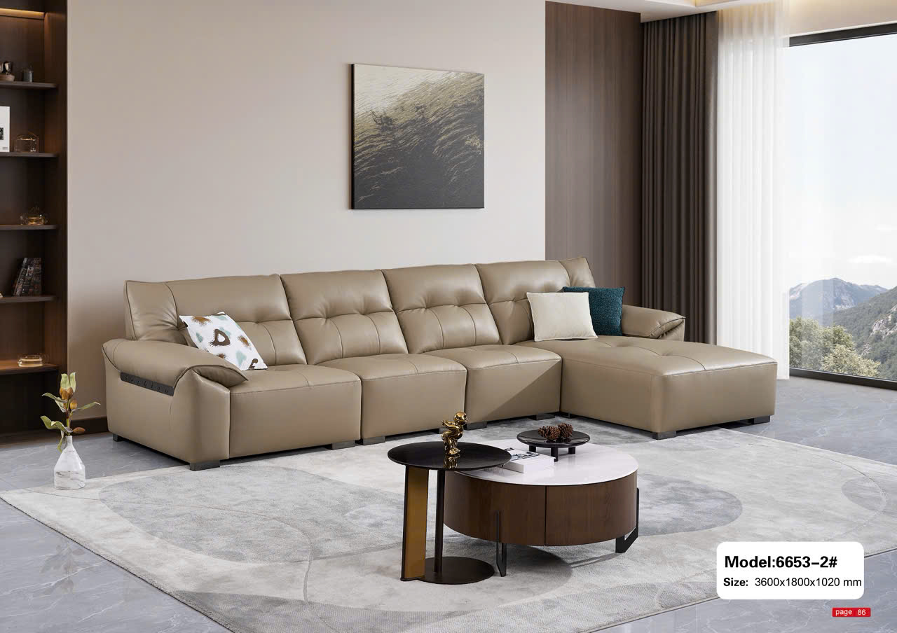 Sofa da nhập khẩu SA6653 sử dụng da bò cao cấp, bề mặt mềm mịn, bền màu và thoáng khí, càng dùng càng đẹp.